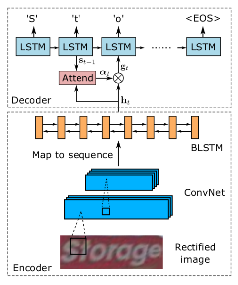 作者使用双向解码器扩展的seq2seq模型来解决识别问题。由于seq2seq模型的输出是由RNN生成的,因此它获取了字符依赖关系,从而将语言建模融入识别过程。此外,双向解码器可以在两个方向上捕获字符依赖关系,从而利用更丰富的上下文并提高性能。下图描述了单向版本的结构。根据经典的Seq2Seq模型,识别网络的模型由编码器和解码器组成。