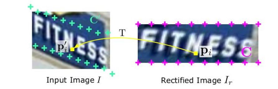 矫正网络自适应地将输入图像中的文本进行矫正并转换成一个新的图像。它基于Spatial Transformer Networks(STN)[2],以一个柔性薄板样条插值变换方法(Thin-Plate Spline)[1]作为核心,该方法负责处理各种不规则文本,预测出TPS变换的参数后,并在无人为标注的情况下进行训练。