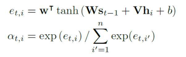 在步骤t时, 解码器预测一个字符或一个停止符号(EOS),根据编码器的输出H,内部状态st−1,和上一步的预测结果yt−1 。在这一步中,解码器首先计算注意力权重,αt∈Rn,通过其注意机制公式: