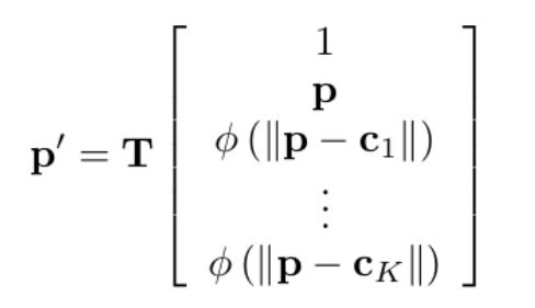 对于输入点p,可以由如下表达式得到其对应坐标p',其中基础函数φ为φ(r) = r 2 log(r)。范数为欧氏距离。