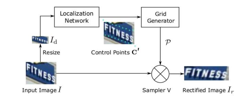 STN网络的核心是将图片空间矫正过程构建成可学习模型,流程如图所示。先将输入图片downsample到Id,定位网络与格点生成器生成TPS变换的参数,再通过采样器(sampler)生成矫正后的图片Ir 。
