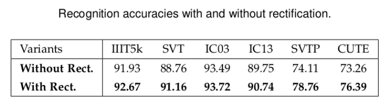 作者在IIIT5k, SVT, IC03, IC13, SVTP, CUTE这6个数据集进行了无矫正网络与有矫正网络的识别结果对比,识别精度对比结果如表格所示。
