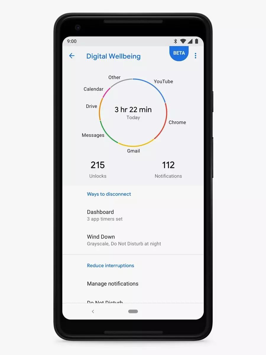 在Android Pie中,这意味着你可以进入设置,看到一个指示板,它会告诉你你今天在手机上花了多少时间,以及哪些应用和服务是最消耗时间的。你会知道你每天打开手机多少次,收到多少通知。