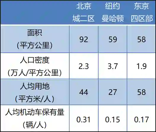 北京、纽约、东京的面积、人口密度、人均用地和人均机动车保有量对比