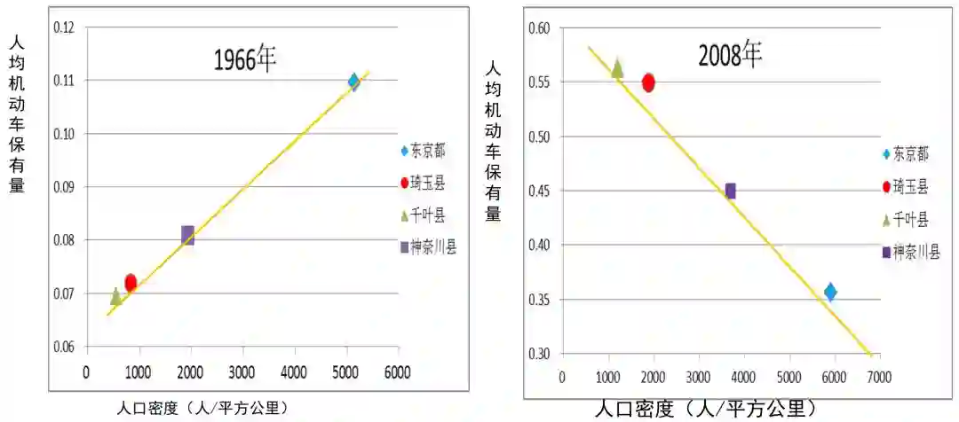 图16:东京1966年和2008年人口密度与人均机动车保有量对应关系的变化