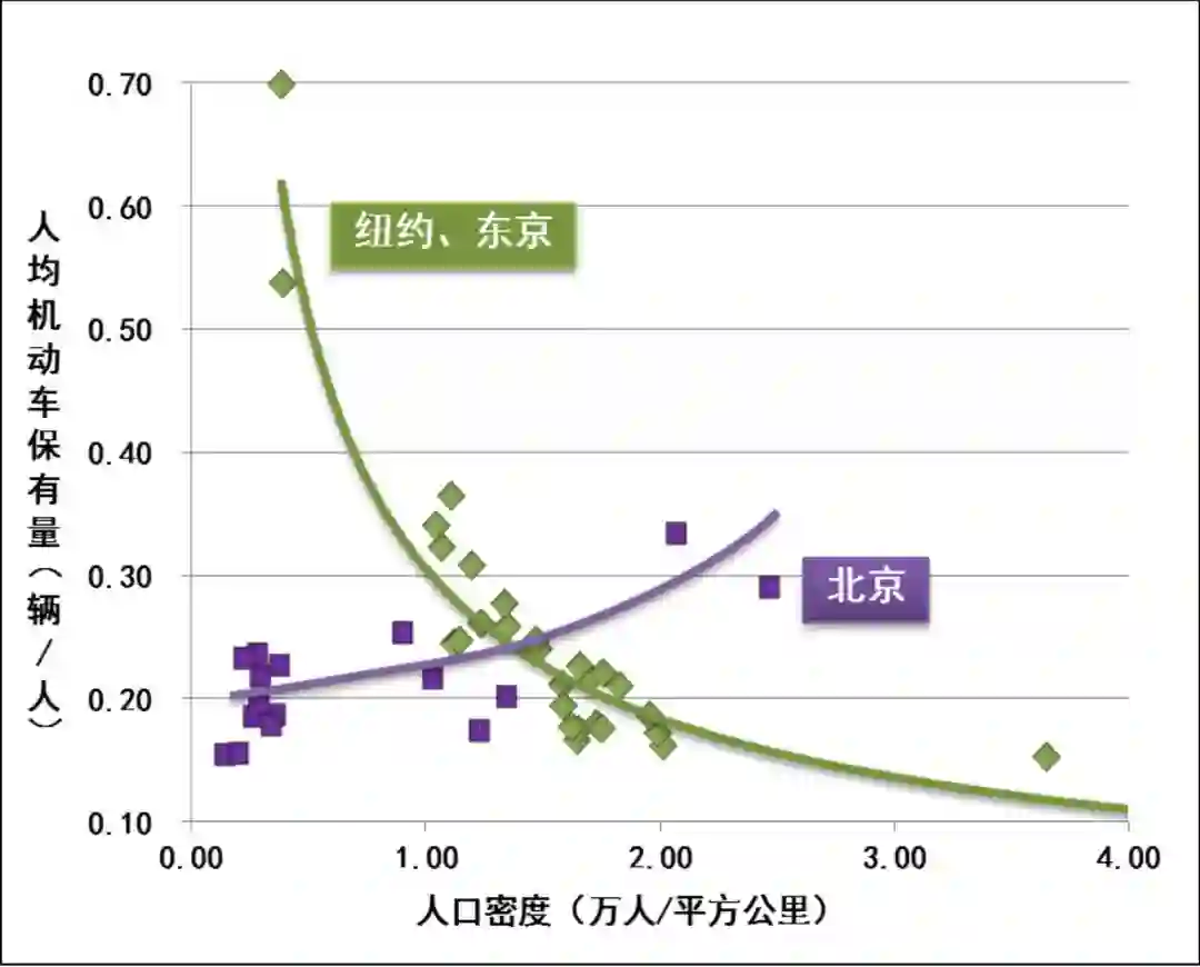 图15:北京、纽约、东京的人均机动车保有量与人口密度的对应关系