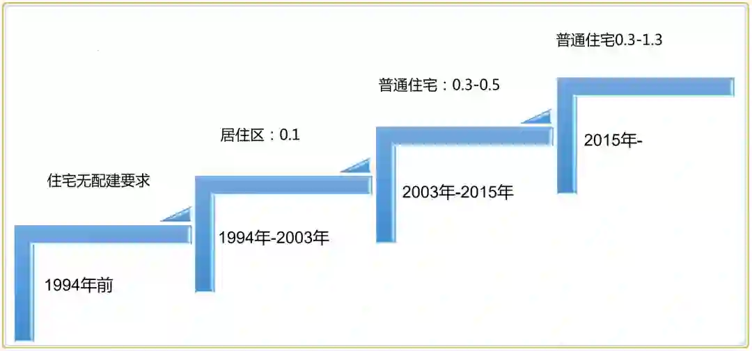 1994年以后建设的住宅区开始逐步配建停车位,现在新建高档居住区基本达到了一户一位的标准。