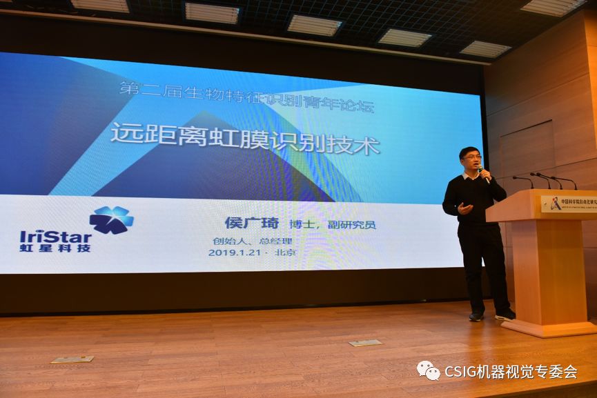 虹星科技CEO侯广琦博士在题为“远距离虹膜识别”的报告中,首先介绍了生物特征识别在人们生活过程中的应用和带来的便利性,对多模态生物特征历史和种类进行了阐述,详细介绍了虹膜生物特征的特点,以及其研究发展历程,提出互联网和人工智能的发展为虹膜识别提供了无处不在身份认证的应用需求,同时也提出新挑战,着重分析了虹膜识别研究过程中面临的难题和技术发展趋势,最后介绍了虹星科技在远距离虹膜识别研发,包括成像和算法等技术以及产品化取得的最新进展,特别是展示了行进中虹膜识别技术获得大家的高度认可和关注。
