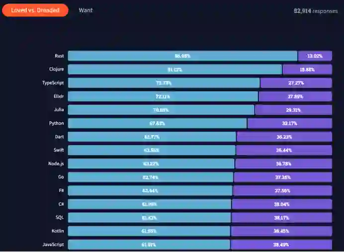 相比之下,作者认为下面的“最想用的编程语言”排名对于专业的程序员来说更有参考价值。在此排名中,Go 语言和 Rust 语言是非常接近的。不过,它们还不及那些绝对主流的脚本语言。从这里我们也可以看出,编程语言的易用性(以及程序的开发效率)对于开发者们的选择来说是至关重要的。