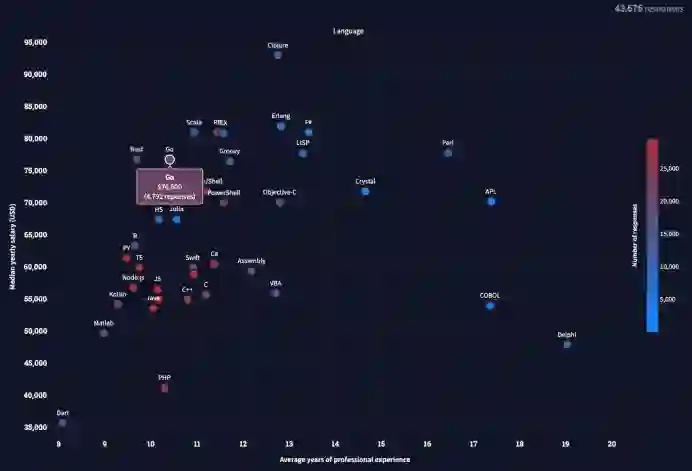 我们可以看到,在全球范围内,Go 语言的薪资还是很高的。这甚至比更加新颖的 Julia 语言和 Swift 语言还要高。而作为 Go 语言强劲对手的 Java 语言,可能是由于市场过于饱和,相关开发者的年薪中位数与 Go 语言相差甚远。