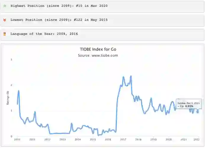 在今年的 11 月 10 日,Go 语言迎来了它的 12 岁生日。从趋势来看,Go 语言在 2021 年是比较稳定的。TIOBE Index(著名的编程语言排行榜)对 Go 语言的使用情况统计(https://www.tiobe.com/tiobe-index/go/)很明显地说明了这一点。这与它从 2010 年到 2018 年间的大起大落形成了鲜明的对比。