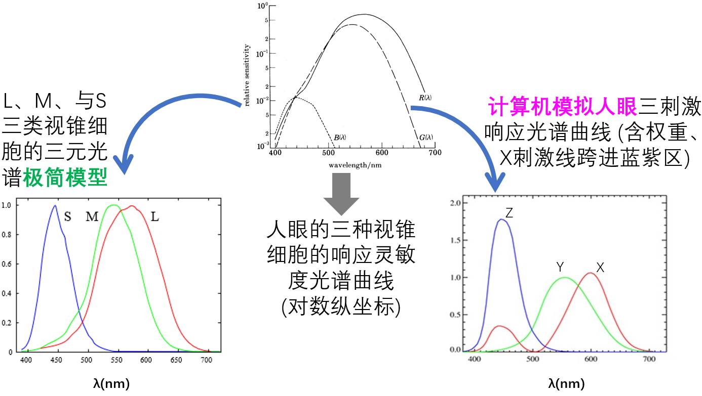 另外,三色感知之间有较大的不对称性,如图3所示,尽管极简响应光谱模型看起来三种视锥细胞看起来无明显差异,但根据三种视锥细胞原始的灵敏度光谱曲线[5],除了蓝色感知灵敏度相对红绿感知明显偏低之外,还可以看到红色视锥的灵敏度曲线在蓝色光谱区域中也存在一个小肩,这说明人眼在结构和性能上用感知细胞的不对称性弥补前一点提到的缺口,这从如图3右下角所示国际照明协会CIE定义的标准观察者光谱图可以获得更强烈的印证,即通过与相对单一的YZ刺激谱线明显对比跨红蓝两色区的X刺激曲线、适当的相对比值权重调整,达到更完美的模拟人类对颜色的感知结果,也就是说针对单调的自然色彩光谱,人眼相应的用不对称的感知予以补偿,以获得整体上较高的感知颜色对称性和美。