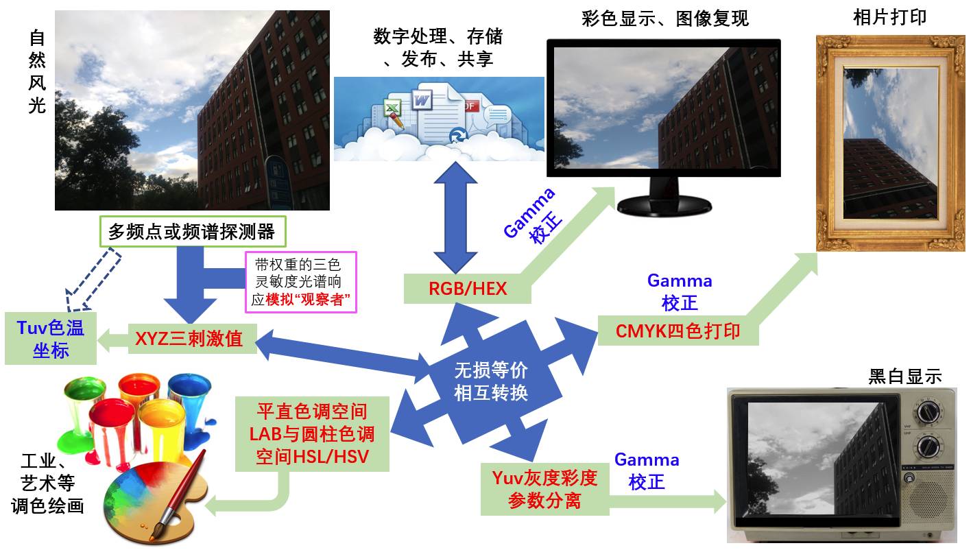 一个是为什么会有那么多不同的颜色表示系统?答案很简单,因为颜色的应用场景很多,且多个场景的表示和应用不明显共享参变量。如今数码时代3岁婴儿都会拍照,殊不知不到1秒的拍照过程涉及到隐藏的颜色相关过程其实相当复杂,参考作者汇总结果如图7所示,拿一幅作者所在办公大楼在蓝天下一角的照片举例,该数码照片的拍摄过程是一个颜色获取、记录、处理、显示过程,在传感器对自然风景成像,第一步是模拟观察者将原始多频点探测器响应信号转换成XYZ三刺激值(此时可以顺便获得色温信息,避免后期转换会碰到同温异色更异谱的麻烦),XYZ可以通过无损的线性矩阵变换获得红绿蓝RGB值或一个六位十六进制数表示的颜色,用于存储、发布或云共享;此时如果要在屏幕显示,还涉及到gamma伽马校正,否则会因为线性RGB色度空间与人眼感知的非线性不匹配带来颜色失真的问题(属于网上搜索结果一堆的已有知识,不多讲);随后,如果要将风景打印或数码冲印出来,需要将RGB转换成到前面提及的经济的CMYK油墨配色坐标体系;还有一种现在可能不太常用的情形是将数码照片黑白显示,这时需要使用灰度彩度参数分离的亮度色差Yuv系统;最后值得一提的是工业、艺术等调色绘画的应用场景中平直色调空间亮度色调实部虚部LAB或圆柱色调空间色调饱和亮度/色调饱和色纯HSL/HSV系统则会经常被用到。