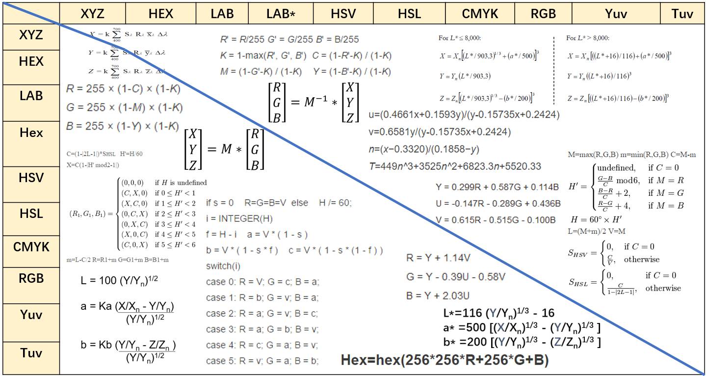 另一个是多个坐标系统之间怎样变换?为供对数理感兴趣的读者提供方便,作者搜集了多个颜色系统之间变换的公式放在图8所示的大矩阵当中,可见这些转换中有部分通过矩阵联系,但要注意到矩阵并非万能,在变换空间之间存在非线性扭曲情况下,用于线性变换的矩阵则无法使用。当然,对于变换过程不关心、也许只会偶尔应用一下变换的读者,推荐使用这个在线转换工具 https://www.easyrgb.com/en/convert.php 。