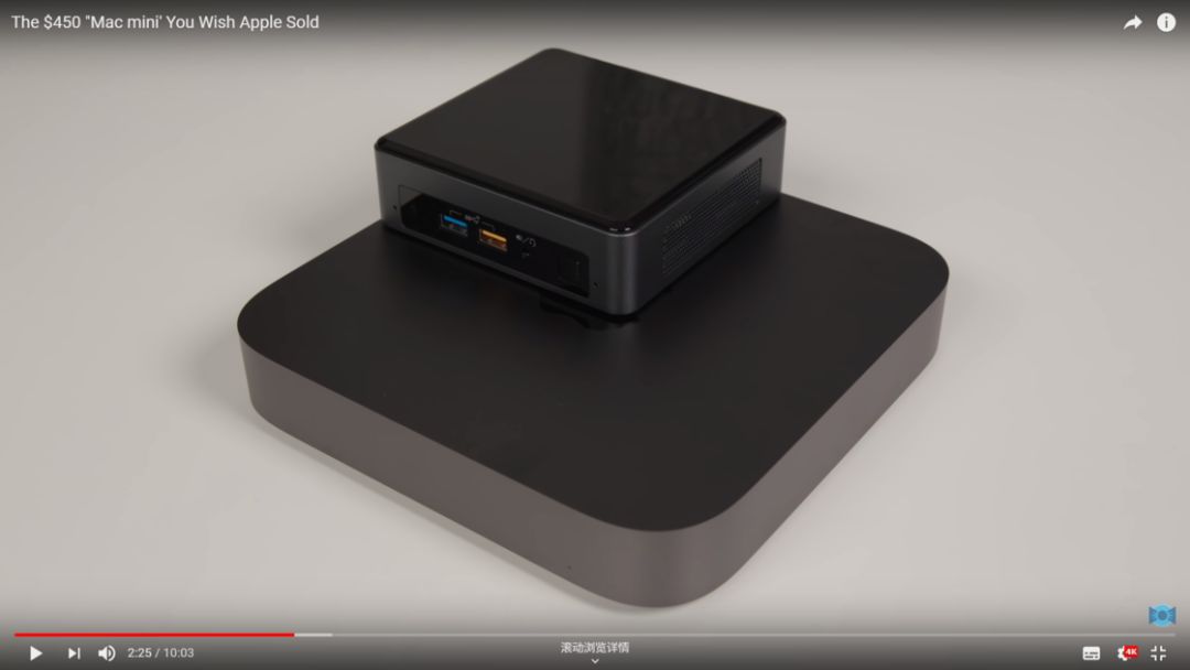 NUC 整体非常简洁,正方形的机身、通体黑色的外观让 NUC 即使摆在桌子上也非常优雅,更不要提仅仅 10cm 长宽(117mm * 112 mm * 36mm)的外形。在 Snazzy Labs 的 YouTube 视频 The $450 "Mac mini' You Wish Apple Sold 里面有这样的一个对比: