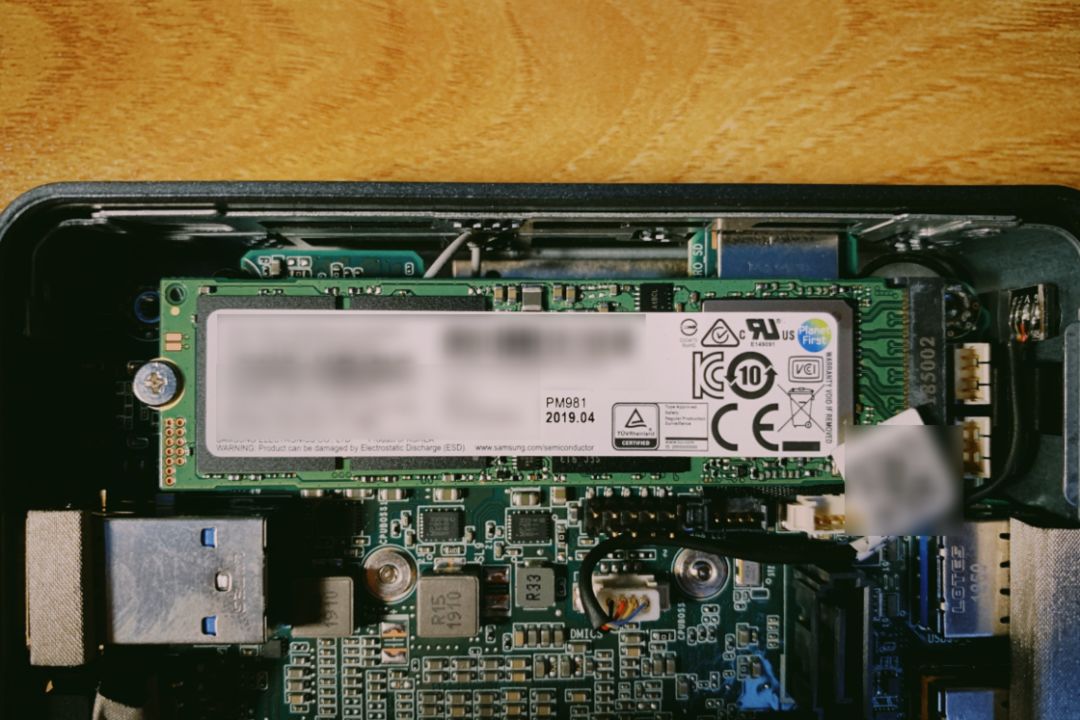 由于我购买的 NUC 是「瘦子版」BEK 的,所以内部只有单个 M.2 的硬盘槽。这个硬盘槽是 M.2 22×42/80 接口的1 ,支持 NVMe 和 SATA 3 协议的固态硬盘。我购买的是同学推荐的三星 PM981 固态硬盘,256GB。