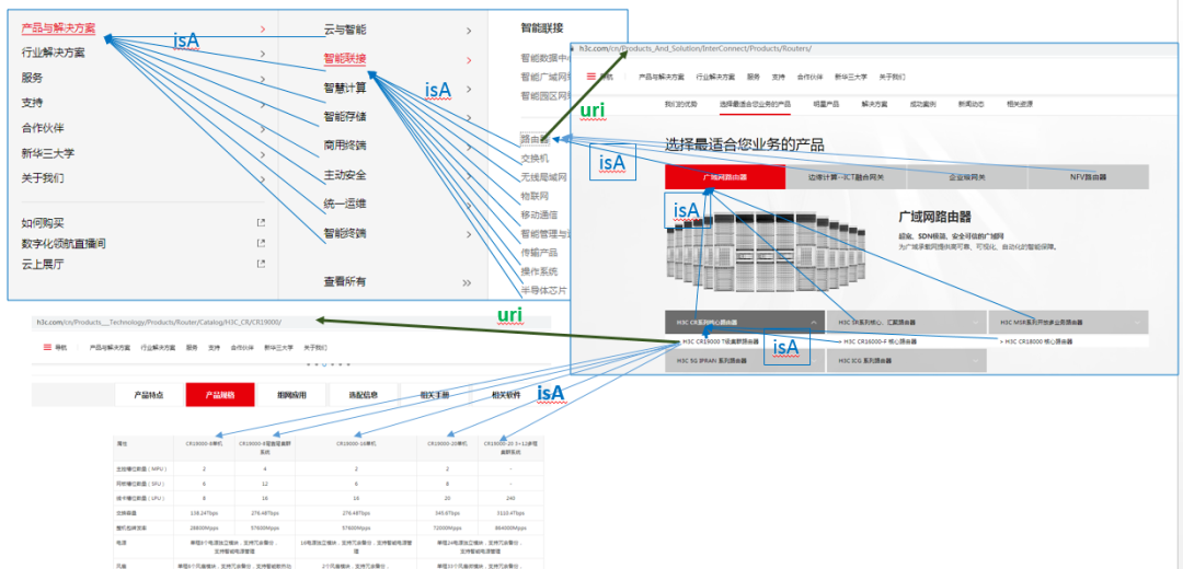 知识处理一定是一个从易到难,从粗到细、从人工到自动的过程。首先,为了构建一个初始的知识库,首要的目标是数据结构化。资料管理通常是树形结构,如新华三官网,以树状结构梳理了产品类型-产品系列-规格型号的关系,在产品规格型号一页,又以表格记录了产品的各种软硬件规格描述。所以,可以使用爬虫系统收集和解析产品之间“isA”和“sameAs”的关系,以无监督+词向量的方式对齐了产品规格特性,最终以模板映射到图上三元组关系。