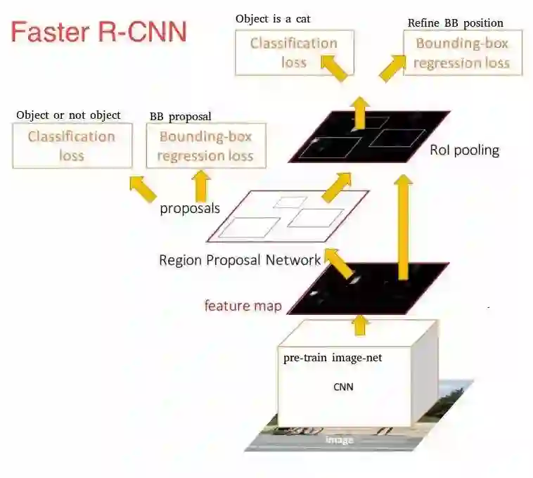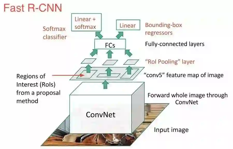 一旦我们有了区域建议,就直接将它们送入 Fast R-CNN 。 并且,我们还添加了一个池化层、一些全连接层、一个 softmax 分类层以及一个边界框回归器。