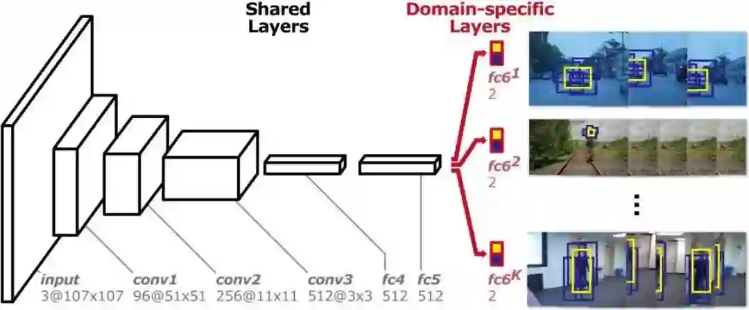 该视频中的一个类的对象可以是另一个视频中的背景,因此, MD Net 提出了“多域”这一概念,它能够在每个域中独立的区分对象和背景,而一个域表示一组包含相同类型对象的视频。