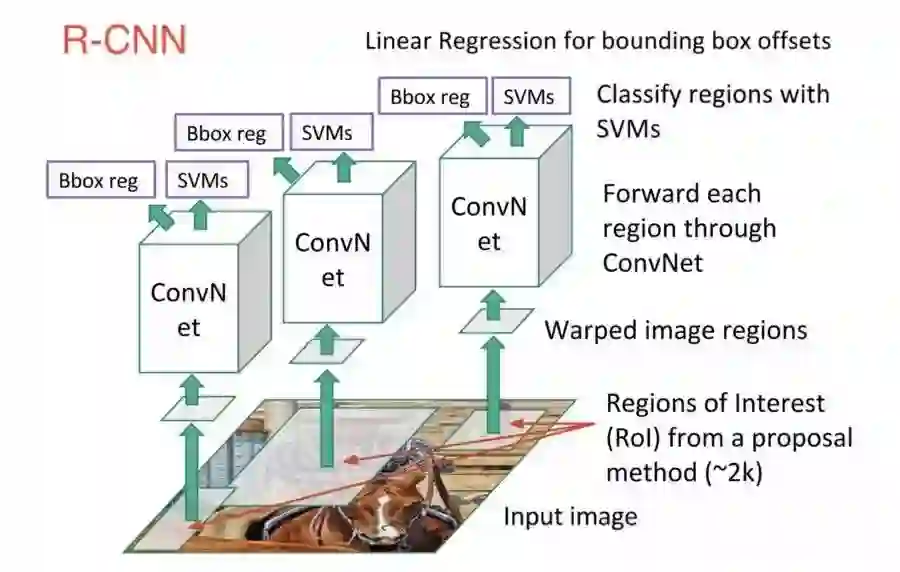 在 R-CNN 中,首先使用选择性搜索算法扫描输入图像,寻找其中的可能对象,从而生成大约 2,000 个区域建议;
