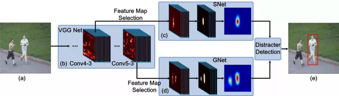 最后,通过 SNet 和 GNet ,分类器得到两个预测热映射,而跟踪器根据是否存在干扰信息,来决定使用哪张热映射生成的跟踪结果。 FCNT 的图如下所示。
