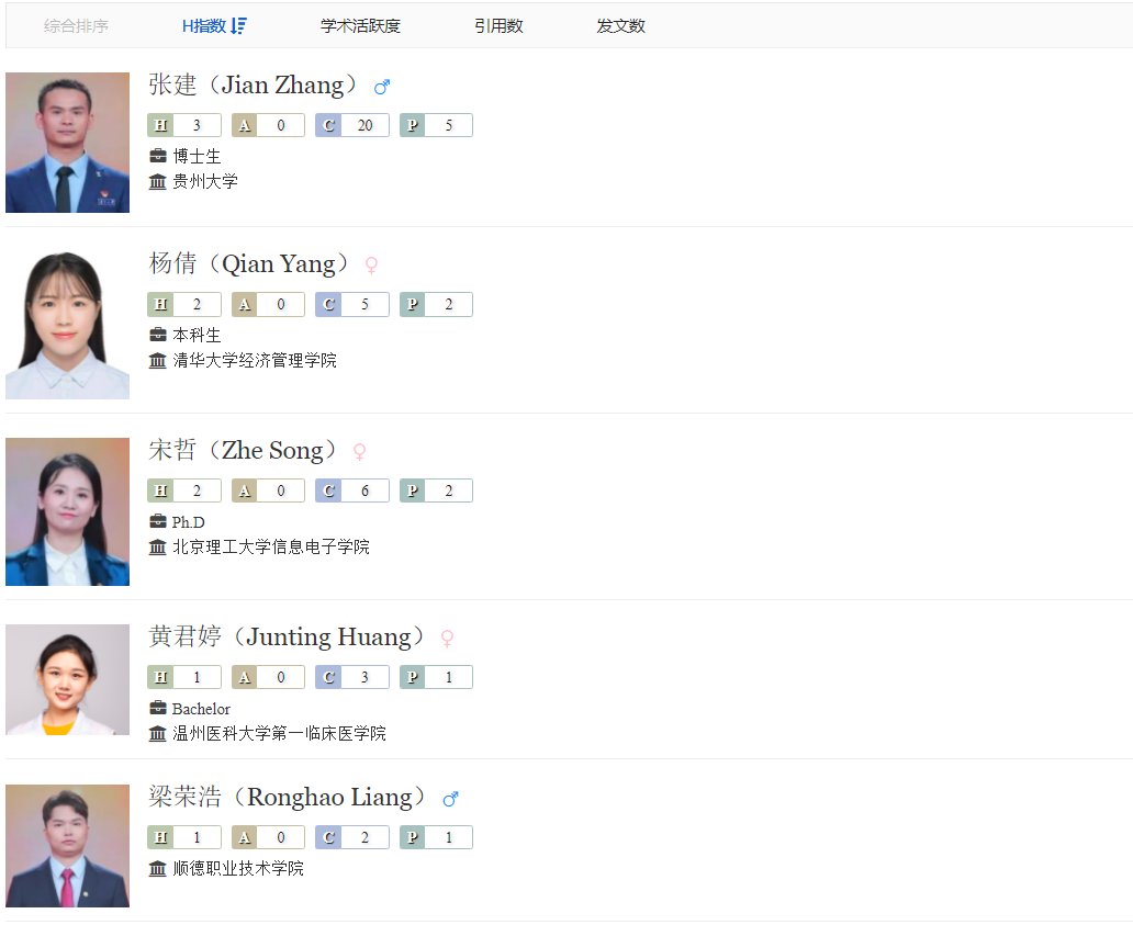在主界面上,以 H(H 指数)、A(学术活跃度)、C(引用数)、P(发文数)四大维度来展示每个大学生的研究指数,同时提供个人基本信息及研究兴趣。