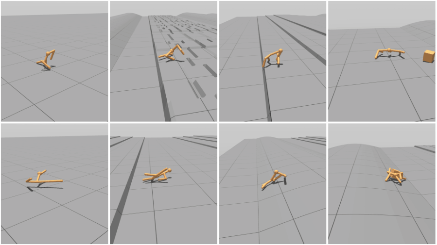 这些Unimal生长在不同的星球中,星球中充满了「起伏的山丘」和「低矮的障碍物」,他们在更加激烈的环境中展开竞争。