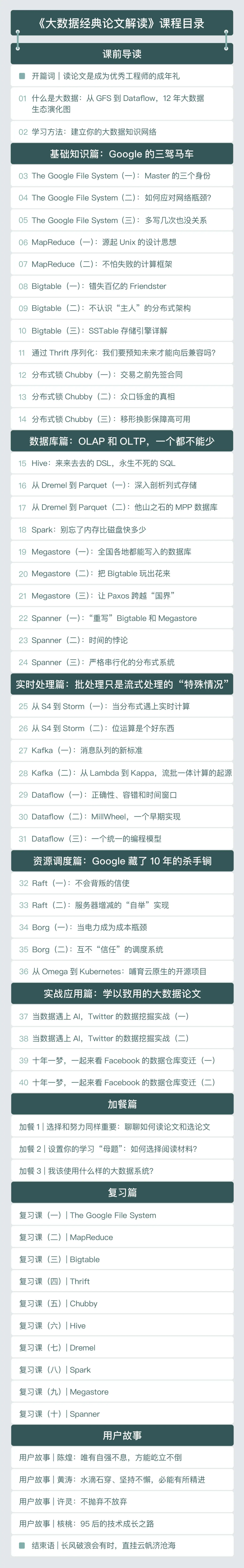 网上这类的资料其实并不多,最近看到极客时间专门做了个专栏《大数据经典论文解读》,我第一时间买来看了看,看目录发现内容太全了,基本覆盖了读论文的痛点问题。