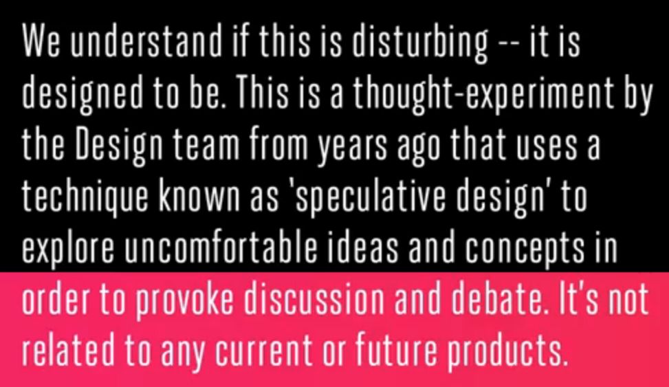 视频被报道后,谷歌赶紧发表了声明,这个视频的内容只是几年前一个设计团队的想法,他们故意提出这些令人不舒服的思想和概念,来促进大家的讨论辩论。