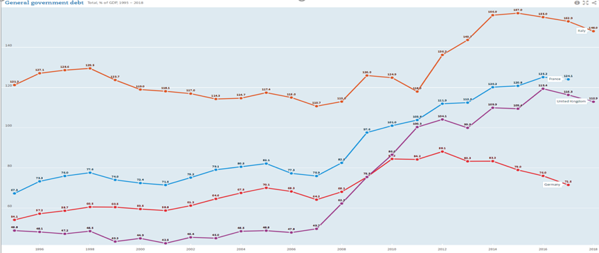 2018年意大利政府的债务对GDP的占比已经高达157%,一方面,主权债务危机始终是个悬于头顶的威胁;另一方面,储蓄流向政府部门,挤出了私人投资,导致需要大量投资推动的制造业发展受限,这导致经济发展条件进一步恶化。