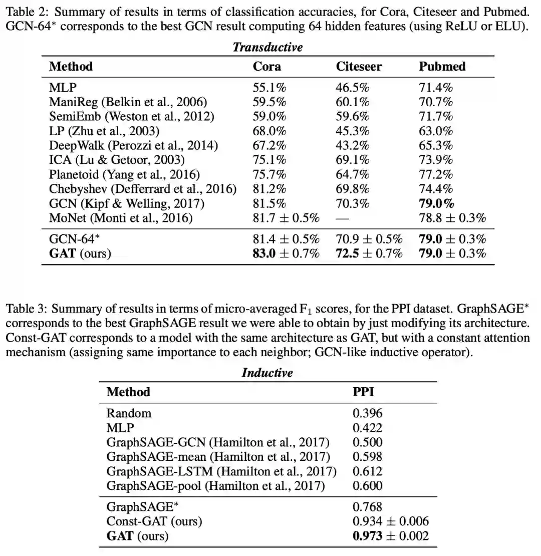 如上表所示,GAT分别在transductive和inductive任务上超越了GCN和GraphSAGE.