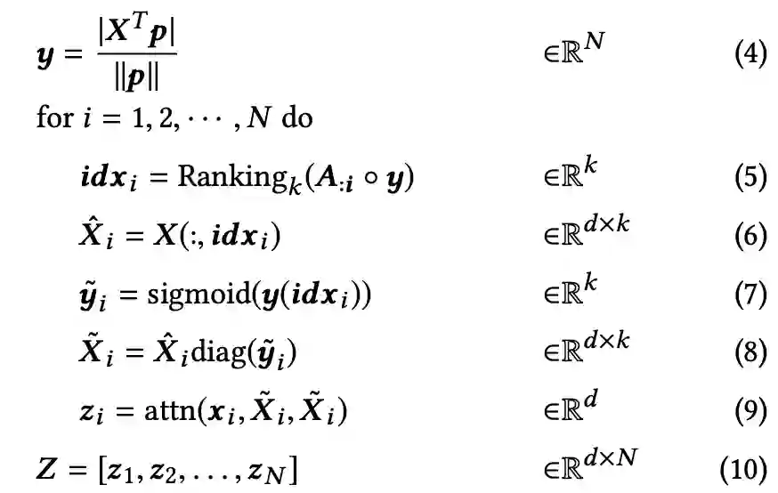 本文使用一个可训练的投影向量p,将特征矩阵X投影到N维向量空间中,y代表每个节点的重要性程度(4)。根据每个邻居节点的重要性程度进行排序,选择k个投影值最大的节点(5)。根据选出的idx,选择新的节点信息(6)。使用门操作来控制信息流,通过将sigmoid函数应用于选定的投影值来获得门向量(7)。通过矩阵乘法控制选定节点的信息(8),在通过注意力机制,生成新的节点信息。