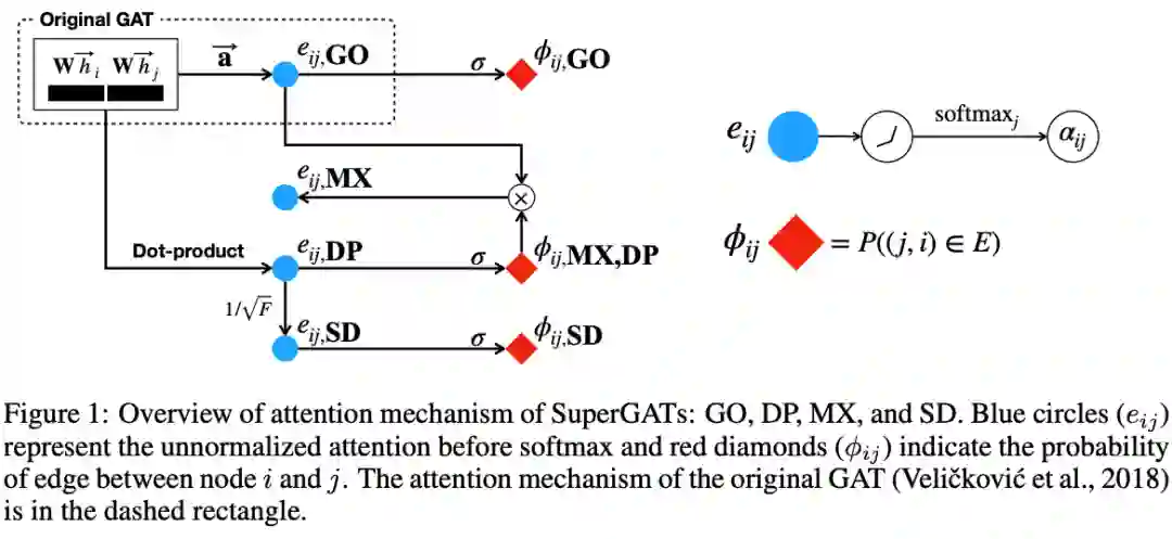 作者提出SuperGATs,旨在通过一个半监督的边预测任务来限制节点的特征向量。该函数预测了节点i和j之间存在边的概率: