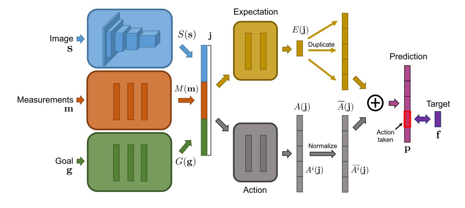 与一般训练agent的过程不同,我们不是去建立状态s和Q值估计值Q(s,a)之间的映射,然后从环境中获得一个奖励r,而是对状态s增加了一系列测量值m和目标g,然后训练网络对每个行动a去预测未来测量值的改变f。