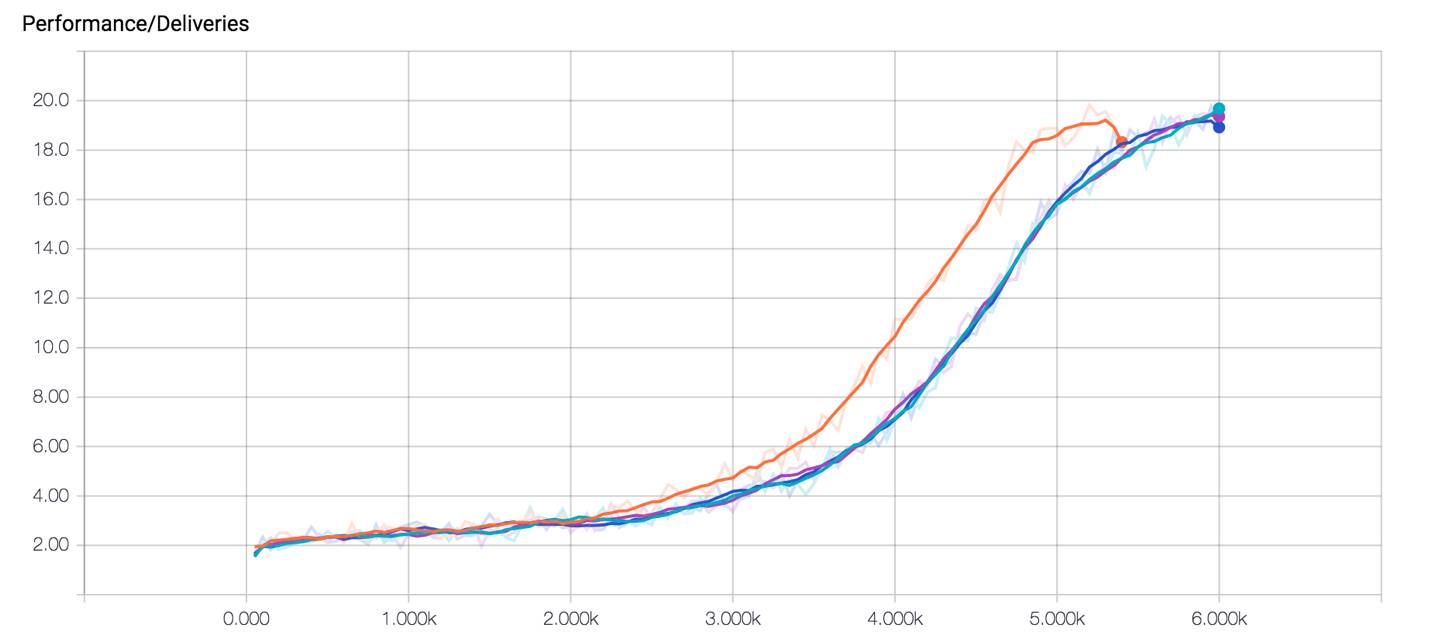 我们的agent能够在每个episode中完成20次投递,这个值可以被认作是在当前场景下的单个episode中最大可能投递数。
