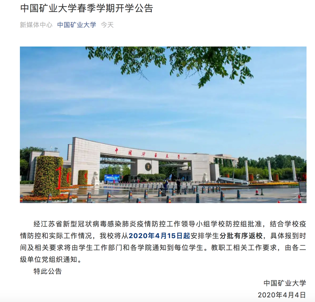 近日,江苏省内各大高校相继发布开学的明确通知,包括中国矿业大学、南京信息工程大学、南京晓庄学院、南京农业大学、金陵科技学院、南京审计大学、南京信息职业技术学院、江苏海事职业技术学院等,开学时间从4月13日开始。