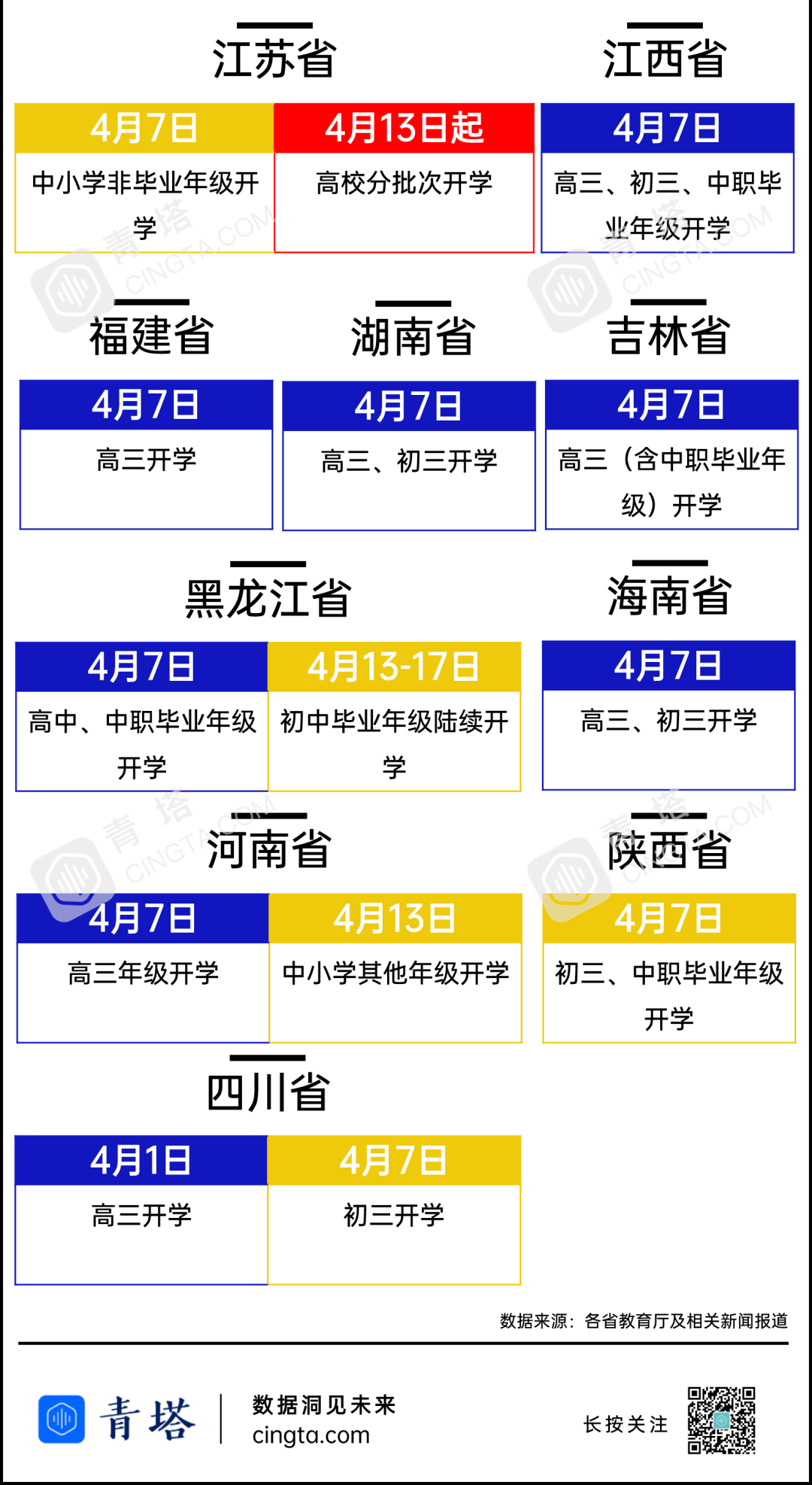 ,成为国内首个明确高校开学时间的省份,4月1日,青海柴达木职业技术学院率先开学,成为国内首批开学的高校。