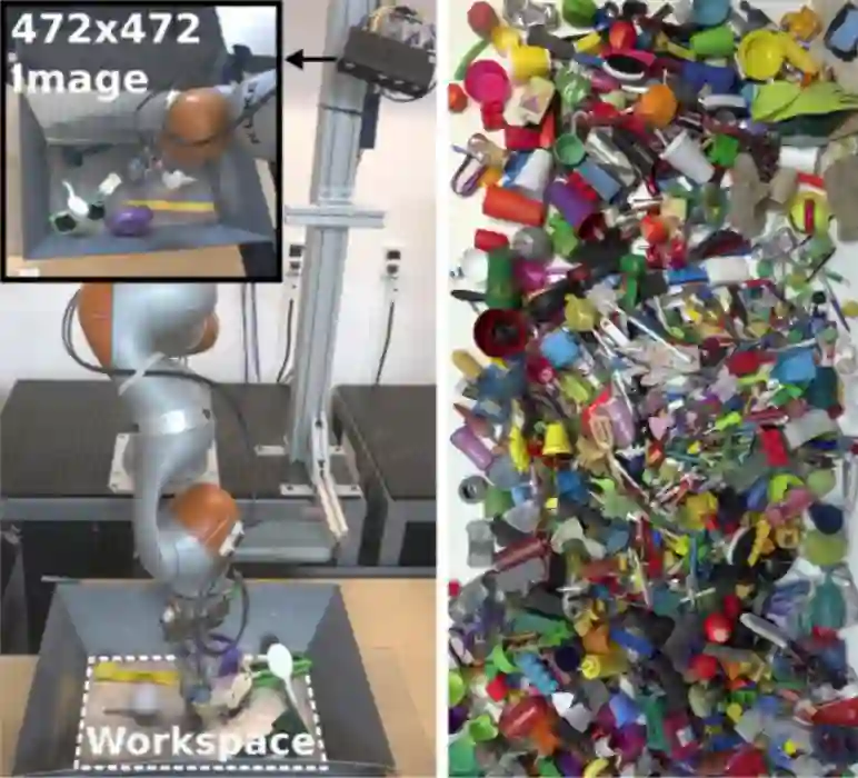 图 2:我们实验环境下的机器人单元的特写(左图)和大约 1000 个视觉和物理特征上不同的训练对象(右图)。每个单元(左)由一个 KUKA LBR IIWA 机器臂、具有两个手指的夹持器和一个放置在机器臂上方的 RGB 摄像机组成。