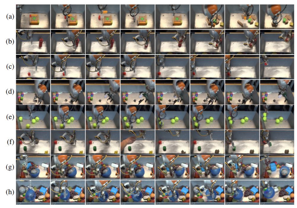 图 4:QT-Opt 策略中的八种抓取场景,展示了我们的方法发现的一些策略:预抓取操作(a,b),抓取调整(c,d),抓取动态物体和从干扰中恢复(e,f),在混乱场景中抓取物体(g,h)。