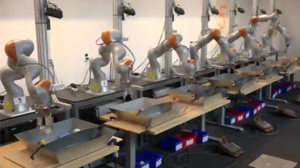 图 1:实验设置了 7 个机器人,在自动的自监督情况下收集抓取片段。