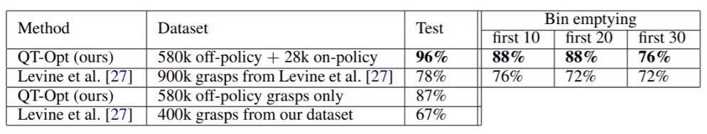 表 1:测试物体抓取成功率的定量结果。将使用物体替换(test)和不使用物体替换(bin emptying)两种情况下的指标来评估策略,后者会显示前 10、20 和 30 次抓取中的成功率。我们的方法的变体使用了在线策略调优,它的失败率比先前测试集上的工作低了四倍多,但却使用了更少的抓取尝试进行训练。只使用离策略训练的变体也大大超过了先前方法的性能。