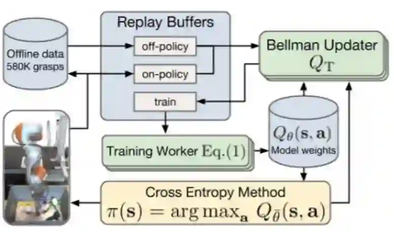 与物体进行交互的操作是机器人技术中最大的开放问题之一:在开放的世界环境中智能地与以前没有见过的物体进行交互需要可以泛化的感知、基于视觉的闭环控制和灵巧的操作。强化学习为解决这一问题提供了一个很有前景的途径,目前强化学习方向上的工作能够掌握如击球 [1],开门 [2,3],或投掷 [4] 这样的单个技能。为了满足现实世界中对操作的泛化需求,我们将重点关注离策略算法的可扩展学习,并在具体抓取问题的背景下研究这个问题。虽然抓取限制了操作问题的范围,但它仍然保留了该问题中许多最大的挑战:一个抓取系统应该能够使用真实的感知技术可靠、有效地抓取之前没有见过的物体。因此,它是一个更大的机器人操作问题的缩影,为对泛化和多样化的物体进行交互提供了一个具有挑战性和实际可用的模型。