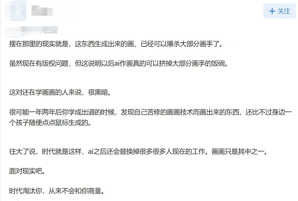 还有网友表示:「AI 绘画可以打败大部分画手了。虽然现在有版权问题,但这说明以后 AI 作画真的可以挤掉大部分画手的饭碗。」
