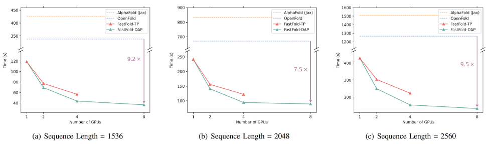 基于Colossal-AI的加速方案FastFold,将GPU优化和大模型训练技术引入AlphaFold的训练和推理,成功超越谷歌和哥伦比亚大学的方案,将AlphaFold训练时间从11天减少到67小时,且总成本更低,在长序列推理中也实现9.3~11.6倍的速度提升。