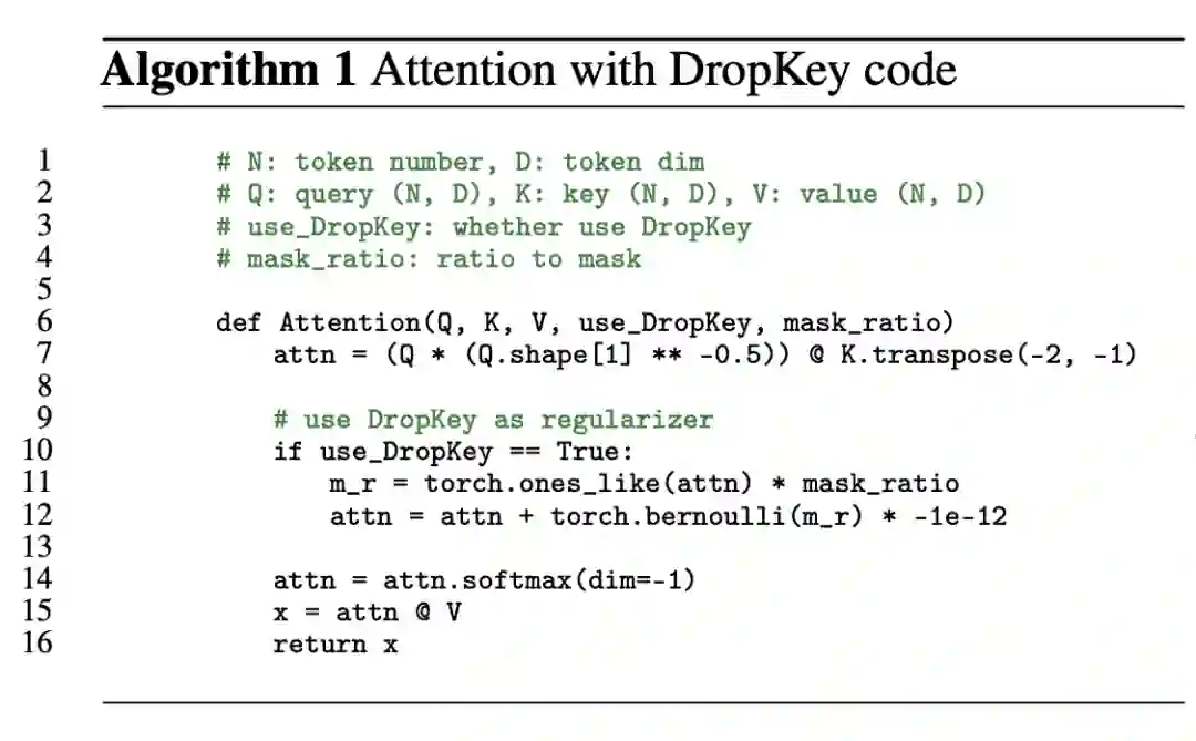 值得注意的是,相对于其他根据特定任务而设计的正则化器,DropKey 无需任何手工设计。由于在训练阶段对 Key 执行随机 drop,这将导致训练和测试阶段的输出期望不一致,因此该方法还提出使用蒙特卡洛方法或微调技巧以对齐输出期望。此外,该方法的实现仅需两行代码,具体如图 2 所示。