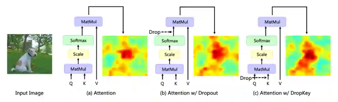 为了克服以上问题,该论文提出了一种即插即拔、仅需要两行代码便可实现的正则化器 DropKey 用以缓解 ViT 类方法的过拟合问题。不同于已有的 Dropout,DropKey 将 Key 设置为 drop 对象并从理论和实验上验证了该改变可以对高注意力值部分进行惩罚,同时鼓励模型更多关注与目标有关的其他图像块,有助于捕捉全局鲁棒特征。