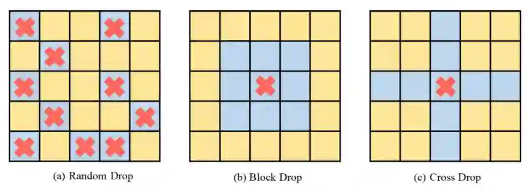 其中,DropKey- Block 通过对以种子点为中心的正方形窗口内连续区域进行 drop,DropKey-Cross 则通过对以种子点为中心的十字形连续区域进行 drop,如图 3 所示。然而,该研究发现结构化 drop 方法并不会带来性能提升。