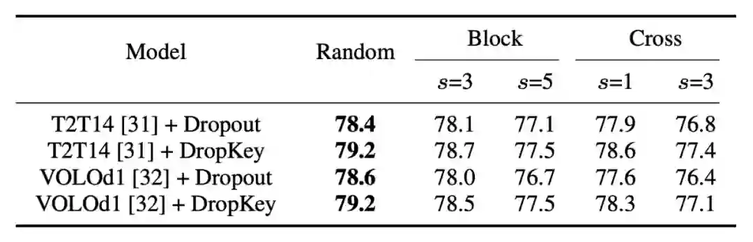 虽然在 CNN 中对结构化 drop 方法已有较为详细的研究,但还没有研究该 drop 方式对 ViT 的性能影响。为探究该策略会不会进一步提升性能,该论文实现了 DropKey 的两种结构化形式,即 DropKey-Block 和 DropKey-Cross。