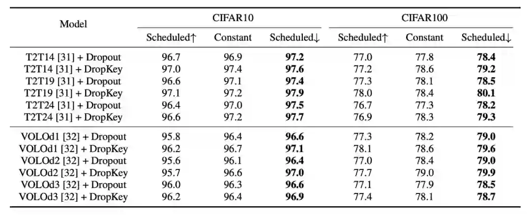 一般而言,ViT 会叠加多个注意力层以逐步学习高维特征。通常,较浅层会提取低维视觉特征,而深层则旨在提取建模空间上粗糙但复杂的信息。因此,该研究尝试为深层设置较小的 drop 概率以避免丢失目标对象的重要信息。具体而言,DropKey 并不在每一层以固定的概率执行随机 drop,而是随着层数的不断加深而逐渐降低 drop 的概率。此外,该研究还发现这种方法不仅适用于 DropKey,还可以显著提高 Dropout 的性能。