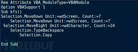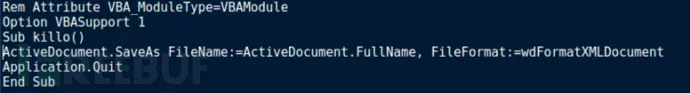 现在,我们已经提取到了可执行文件,以供进一步分析使用。让我们回到宏,并查看最后一个子程序Module1.killo()。简单来说,killo()负责保存Word文档的干净版本(即不包含恶意宏)。为此,它将其保存为XML格式,从而删除文件中的所有宏。最后,killo()会终止程序,让它看起来像是意外崩溃。到这里,恶意宏看起来似乎就已经执行完了,但实际上什么也没有发生。在这种情况下,你忘记了前面提到的会在程序关闭时执行的Document_Close()和closee()。